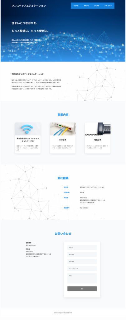 合同会社ワンステップエデュケーション様 2025 11/26 HP制作 コーポレート 2025年12月7日社名合同会社ワンステップエデュケーション様URLhttps://onestep-education.com状況新規作成ドメイン設定サーバー設定WordPressフォームプログラムHTMLCSSJavaScript HP制作 コーポレート URLをコピーする URLをコピーしました! URLをコピーしました! 株式会社Good Innovation 関連記事 株式会社Good Innovation 2025年11月26日 株式会社Good Works 2025年10月24日 株式会社M’s food様 2025年9月30日 MIRAIE 2025年9月30日 GOOD HOLDINGS株式会社様 2025年8月1日 つながるモバイル株式会社様 2025年7月18日 インフィニア光様 2025年7月1日 ⼀般社団法⼈ジャパングローバルハラル認証機構様 2025年2月15日
