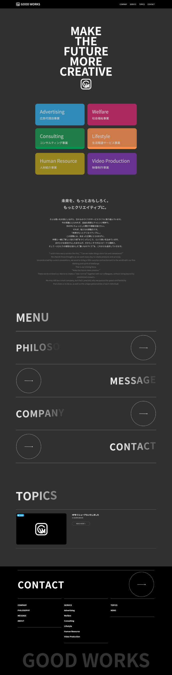 株式会社Good Works 2025 10/24 HP制作 コーポレート 2025年12月7日社名株式会社Good WorksURLhttps://good-works.cc状況新規作成ドメイン設定サーバー設定WordPressフォームプログラムHTMLCSSJavaScript HP制作 コーポレート URLをコピーする URLをコピーしました! URLをコピーしました! 株式会社M’s food様 株式会社Good Innovation 関連記事 合同会社ワンステップエデュケーション様 2025年11月26日 株式会社Good Innovation 2025年11月26日 株式会社M’s food様 2025年9月30日 MIRAIE 2025年9月30日 GOOD HOLDINGS株式会社様 2025年8月1日 つながるモバイル株式会社様 2025年7月18日 インフィニア光様 2025年7月1日 ⼀般社団法⼈ジャパングローバルハラル認証機構様 2025年2月15日