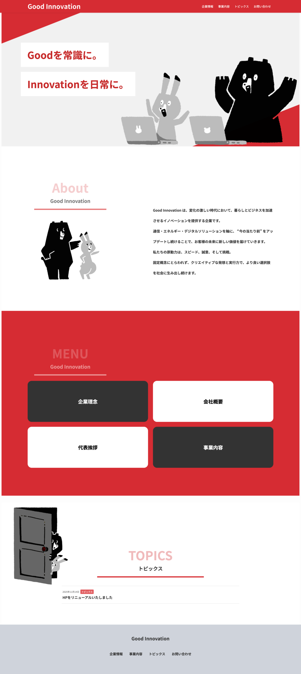 株式会社Good Innovation 2025 11/26 HP制作 コーポレート 2025年12月7日社名株式会社Good InnovationURLhttps://good-innovation.co.jp状況新規作成ドメイン設定サーバー設定WordPressフォームプログラムHTMLCSSJavaScript HP制作 コーポレート URLをコピーする URLをコピーしました! URLをコピーしました! 株式会社Good Works 合同会社ワンステップエデュケーション様 関連記事 合同会社ワンステップエデュケーション様 2025年11月26日 株式会社Good Works 2025年10月24日 株式会社M’s food様 2025年9月30日 MIRAIE 2025年9月30日 GOOD HOLDINGS株式会社様 2025年8月1日 つながるモバイル株式会社様 2025年7月18日 インフィニア光様 2025年7月1日 ⼀般社団法⼈ジャパングローバルハラル認証機構様 2025年2月15日